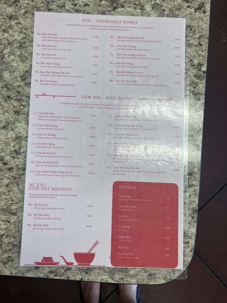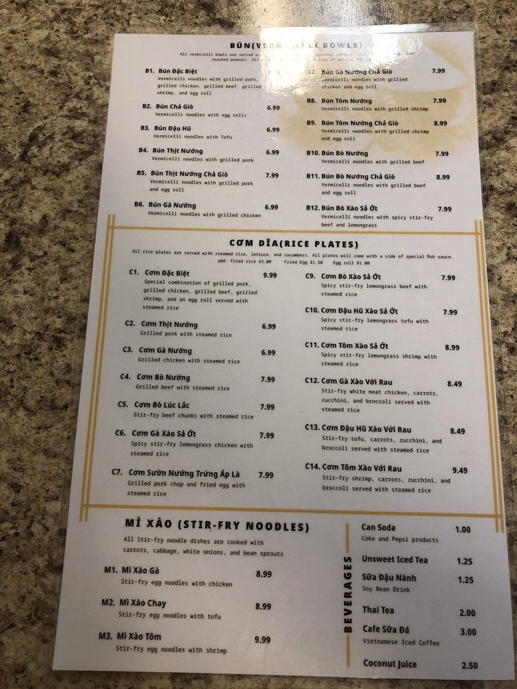 The menu presents an inviting selection, including the special Pho Dac Biet and various bun dishes like Bun Bo Nuong Cha Gio, topped with grilled beef and crisp egg rolls. Customers appreciate the warm atmosphere and friendly service, making it an ideal spot for both casual lunches and cozy dinners.