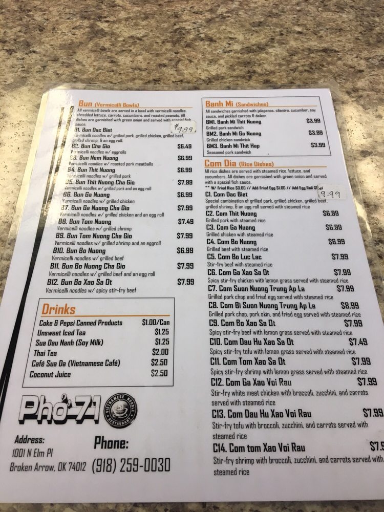 Welcome to Pho 71, a delightful destination for Vietnamese cuisine in Broken Arrow, OK. This charming spot offers an array of authentic dishes, focusing on aromatic pho and vibrant vermicelli bowls. Each bowl of pho is crafted meticulously, featuring rich broths paired with tender meat and perfectly cooked noodles, as highlighted by delighted patrons praising the depth of flavor and freshness.